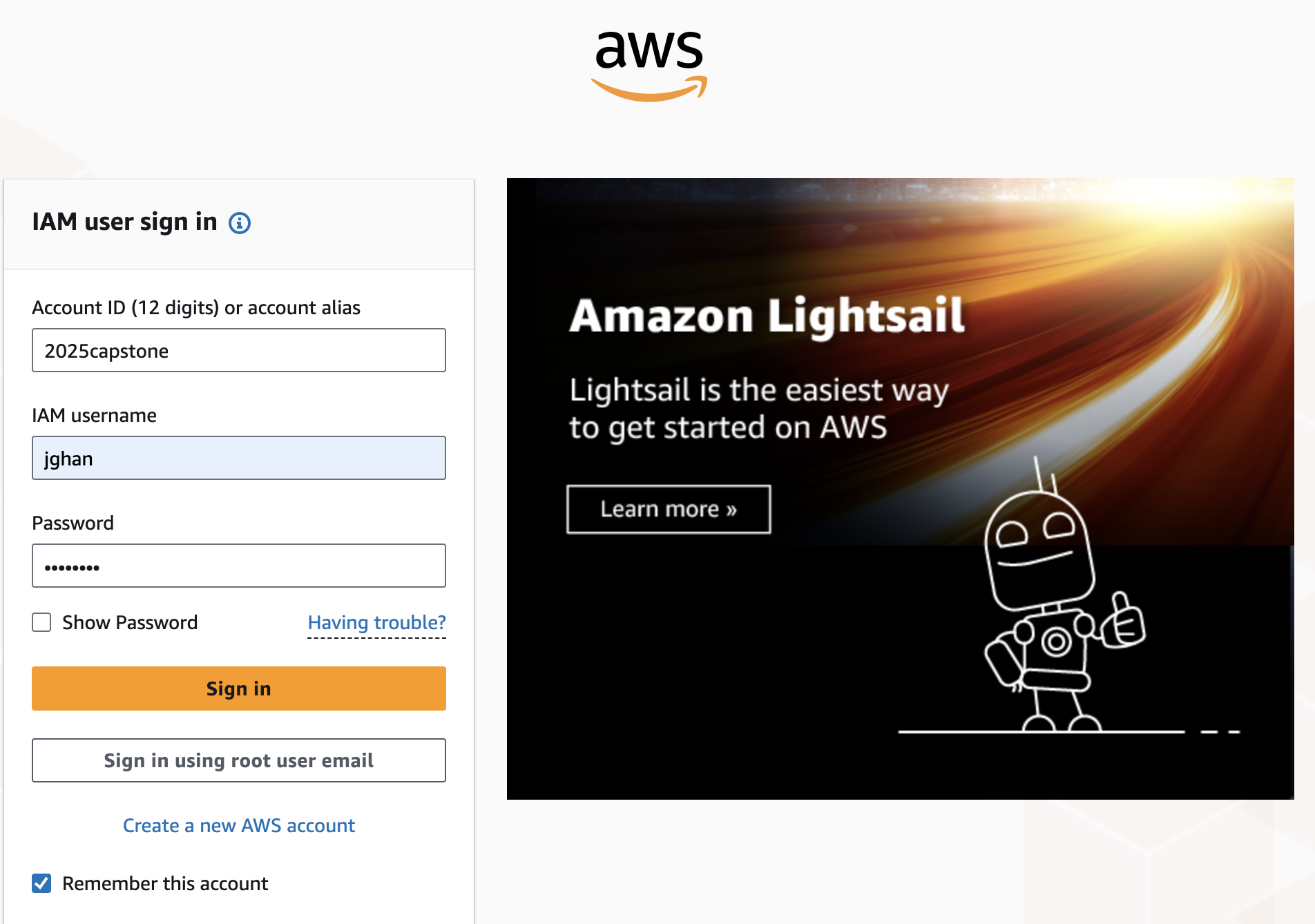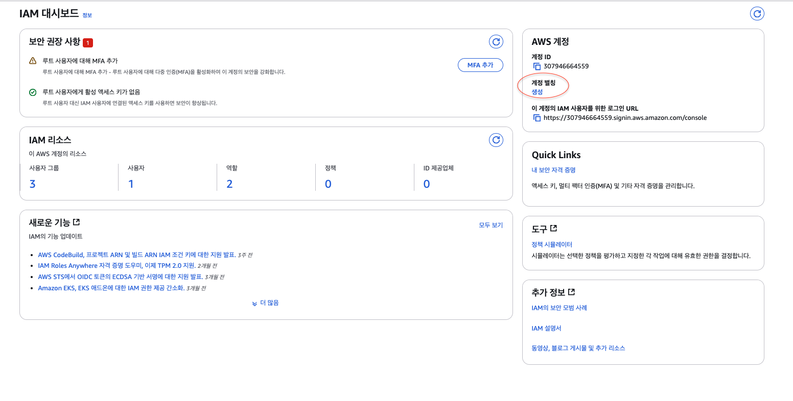 ์ ์ฝ์ ๋ก๊ทธ์ธ ์ฌ์ง์ฒ๋ผ 2025capstone ๊ฐ์ ๋ณ์นญ์ ์ฌ์ฉํ๊ณ ์ถ๋ค๋ฉด IAM ์๋น์ค์์ ์ค๋ฅธ์ชฝ ๊ณ์ ๋ณ์นญ (๋นจ๊ฐ์ ๋๊ทธ๋ผ๋ฏธ) ์์ ์ค์ ํด์ค์ผํจ