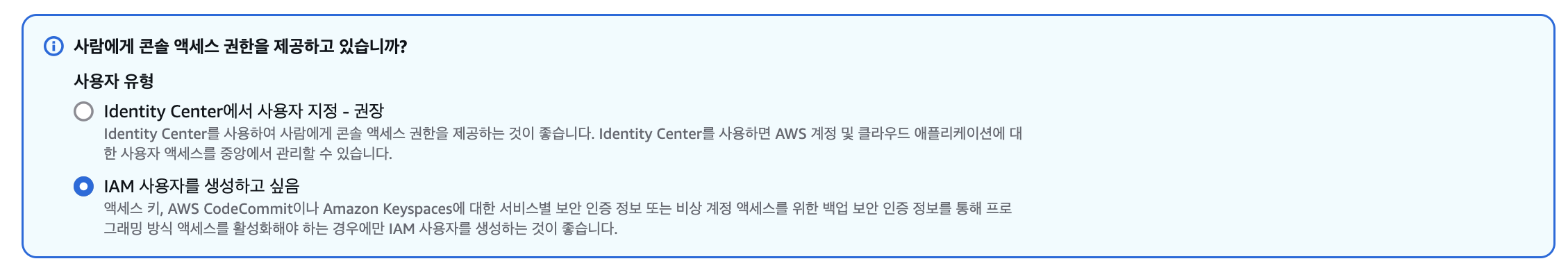 => ๊ธฐ์กด ์ฝ์ ๋ก๊ทธ์ธ ๋ฐฉ์์ผ๋ก IAM ์ ์ ๋ก๊ทธ์ธ์ ํ๊ณ ์ถ๋ค๋ฉด ์ ์ฌ์ง์ฒ๋ผ IAM ์ฌ์ฉ์๋ฅผ ์์ฑํ๊ณ ์ถ์์ผ๋ก ์ค์ ํด์ผํจ