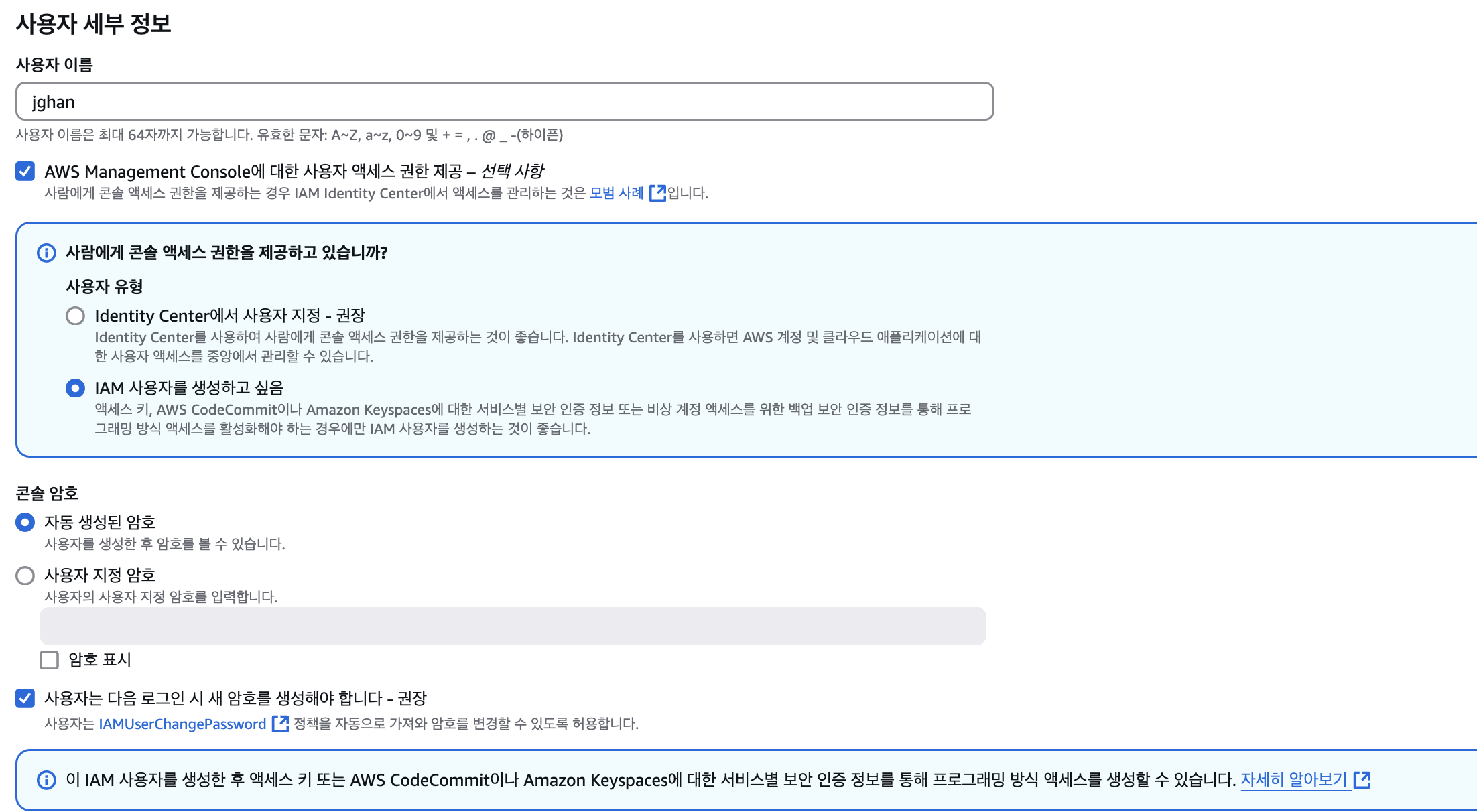 - ์ถํ IAM ์ฌ์ฉ์๊ฐ ์ง์ ๋น๋ฐ๋ฒํธ ๋ค์ ์ค์ ํ๋๋ก ์๋ ์์ฑ๋ ์ํธ๋ฅผ ์ ํํ๊ณ
